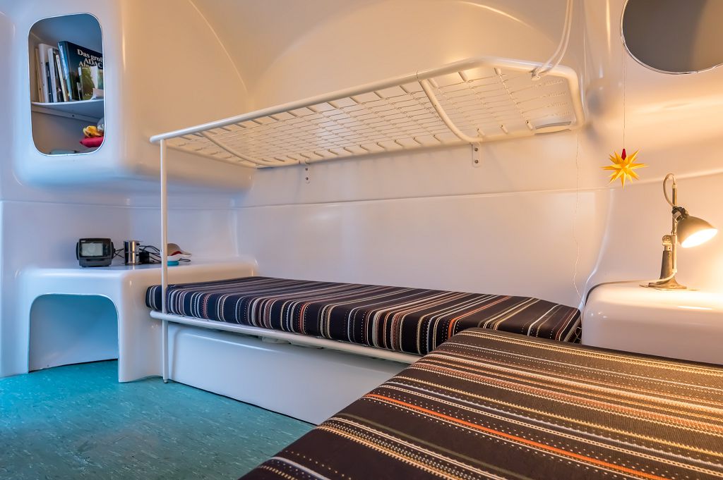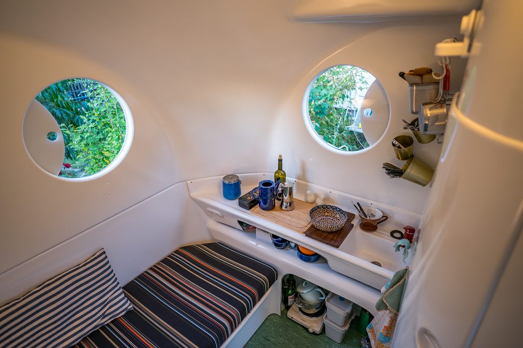 Das Banga Gartenhaus wurde von dem italienischen Designer Carlo Zappa entworfen und von der Firma Bungalows International SRL in Mailand von 1971 bis etwa 1985 produziert und verkauft. Was dieses kleine, aber außergewöhnliche Haus so besonders macht, ist die Verwendung von Kunststoff und Glasfaserverstärktem Kunststoff (GFK), die es nicht nur leicht und widerstandsfähig machen, sondern auch für eine überraschend gute Wärmeisolierung sorgen. Die Außenhaut des Bangas besteht aus einer dünnen, zweischaligen Struktur, die nur 2,5 mm dick ist und einen Mineralwolleschaumkern von maximal 20 mm umfasst. Diese Kombination garantiert einen minimalistischen Materialeinsatz bei gleichzeitig hervorragender Funktionalität – ein perfektes Beispiel für die damalige Philosophie des nachhaltigen Bauens.