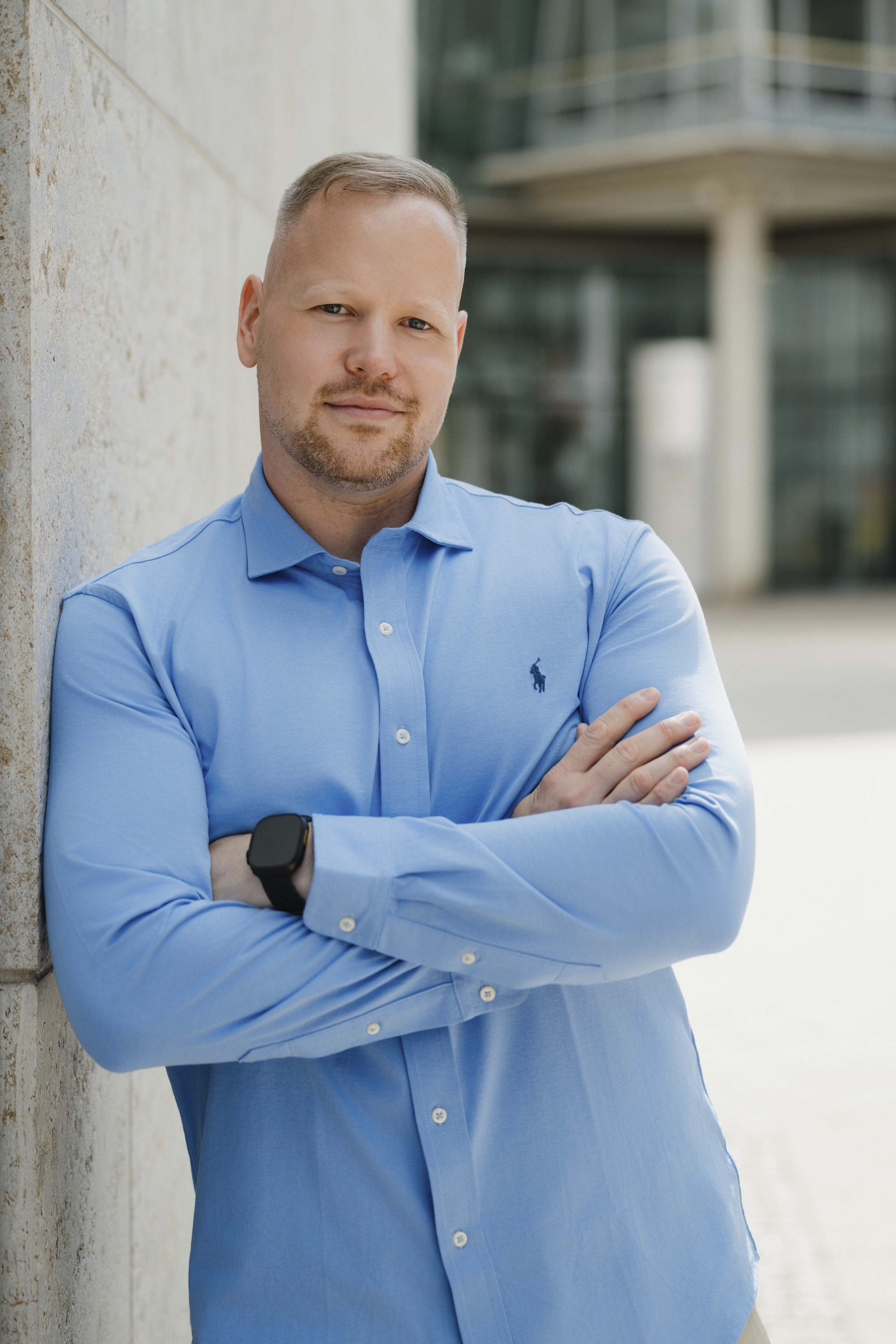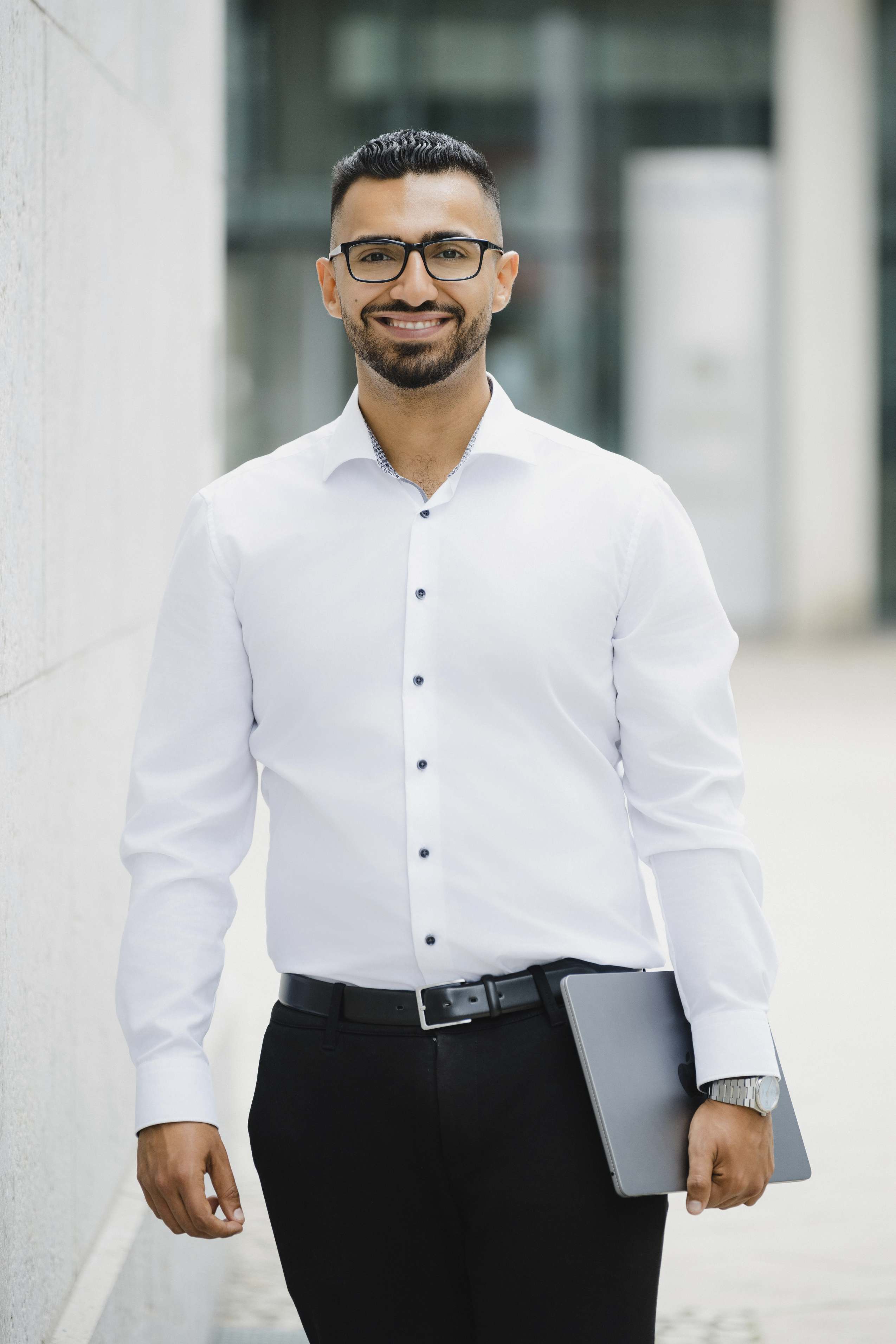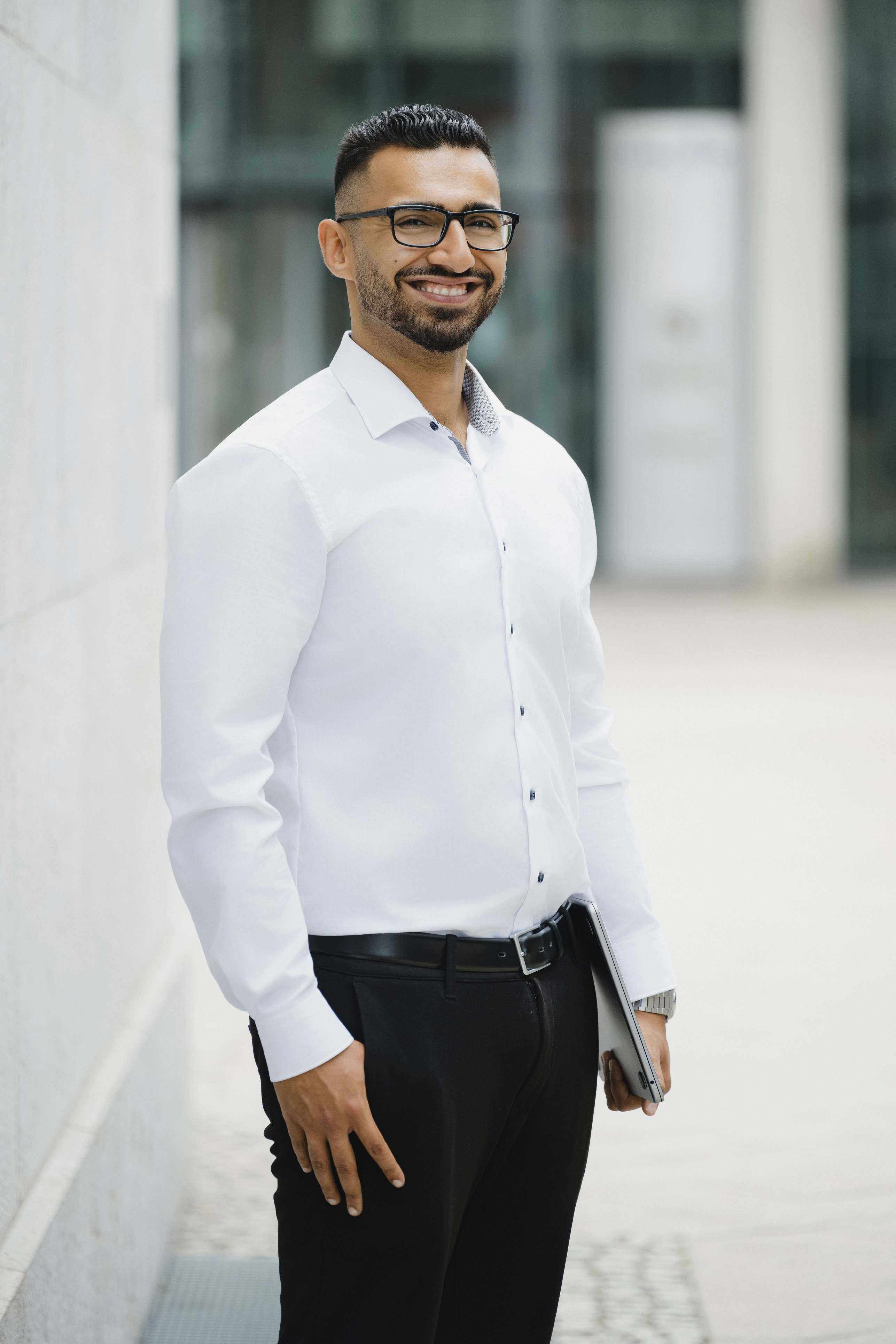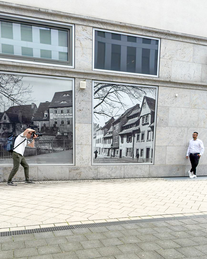 Die Idee kam von Omer: Wir suchten in Halle (Saale) ein modernes Gebäude mit großen Glasflächen, um spannende Spiegelungen in den Bildern zu erzeugen. Sein Vorschlag: das Finanzamt. Klingt ungewöhnlich, oder? Vor Ort stellten wir jedoch schnell fest, dass die Lichtbedingungen dort leider nicht optimal waren. Zu harte Kontraste und ungünstige Schatten hätten die Wirkung der Businessfotos beeinträchtigt.