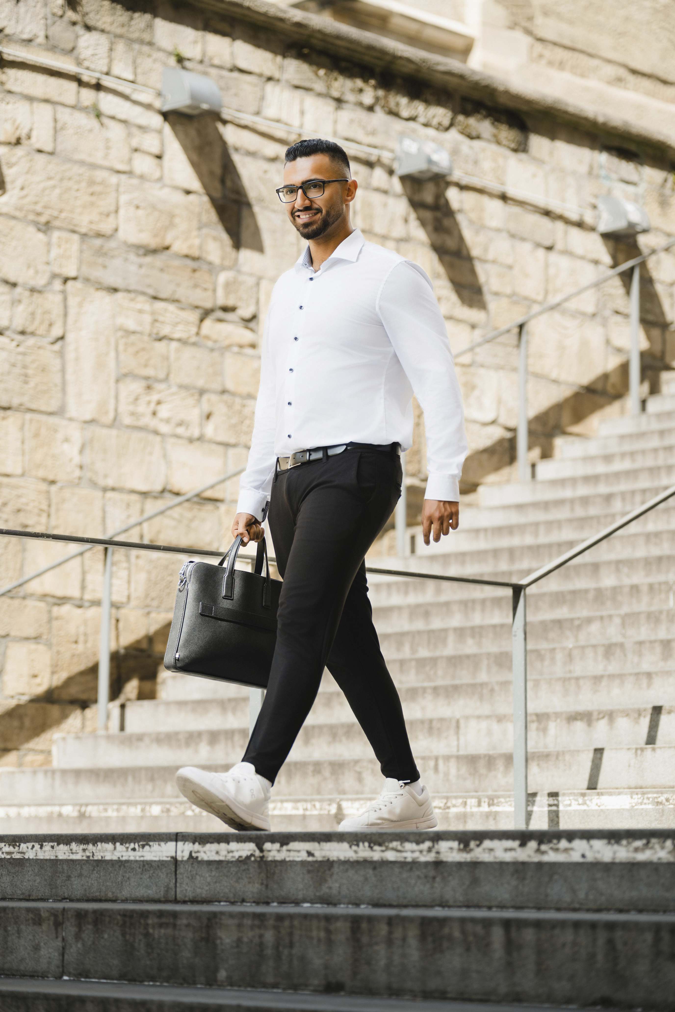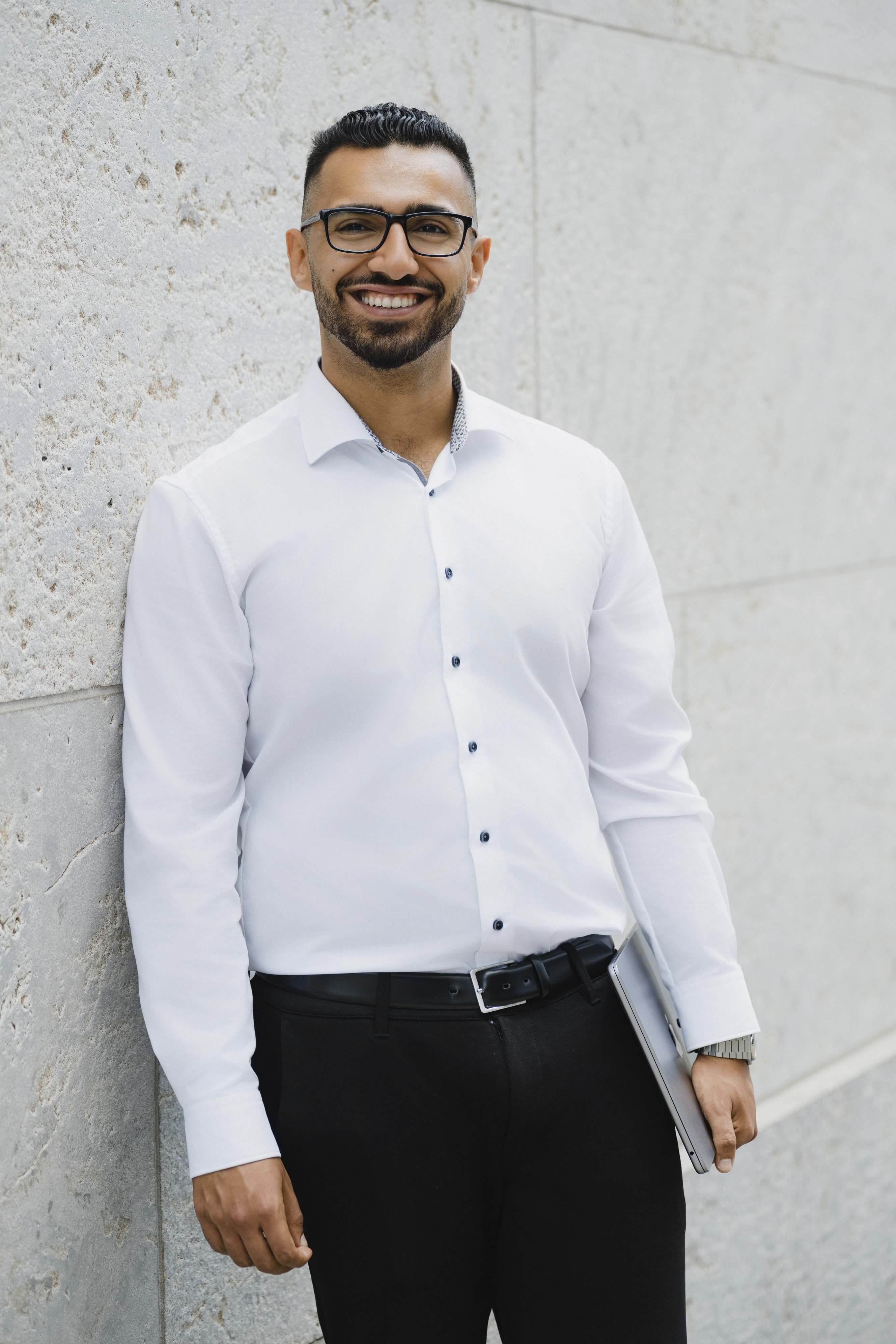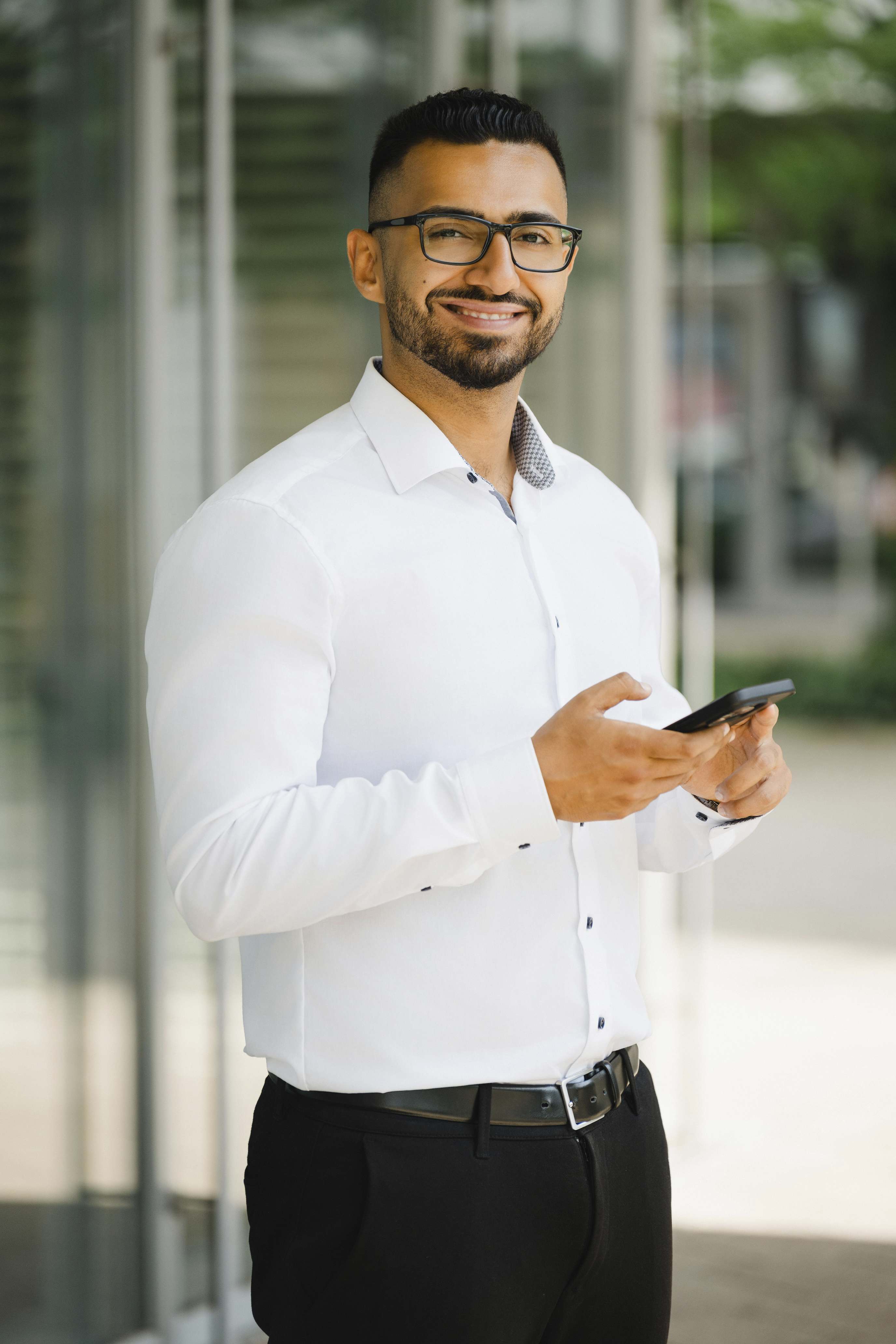Die Idee kam von Omer: Wir suchten in Halle (Saale) ein modernes Gebäude mit großen Glasflächen, um spannende Spiegelungen in den Bildern zu erzeugen. Sein Vorschlag: das Finanzamt. Klingt ungewöhnlich, oder? Vor Ort stellten wir jedoch schnell fest, dass die Lichtbedingungen dort leider nicht optimal waren. Zu harte Kontraste und ungünstige Schatten hätten die Wirkung der Businessfotos beeinträchtigt.